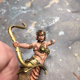 I decided on this Medusa to give her a regular skin color and natural tail colors. The chest and hip armor was painted gloss black in prep for the V. Brass, and the bow is V's Gold. To add a little snake to her face I gave her the slit pupils in the eyes.